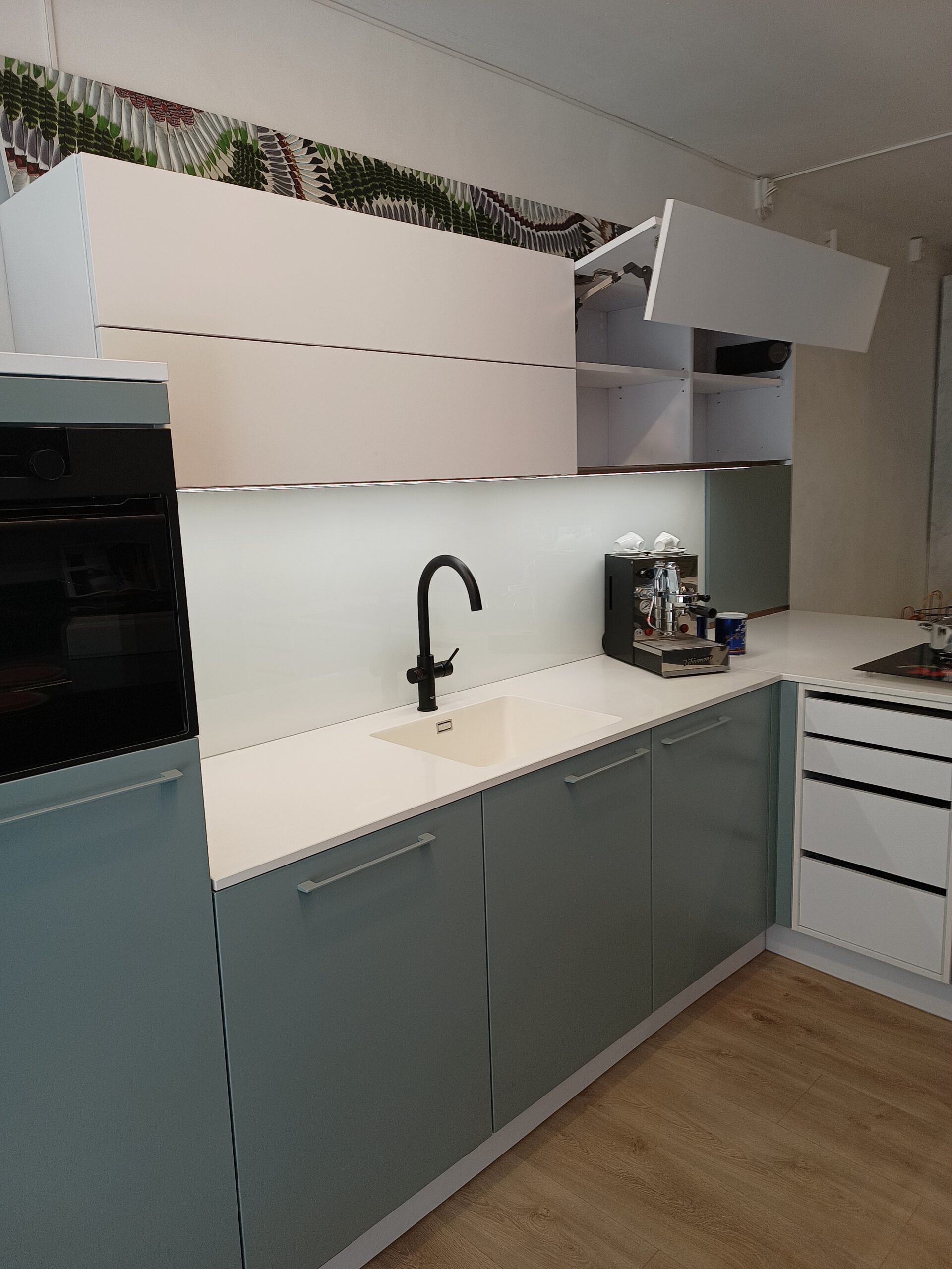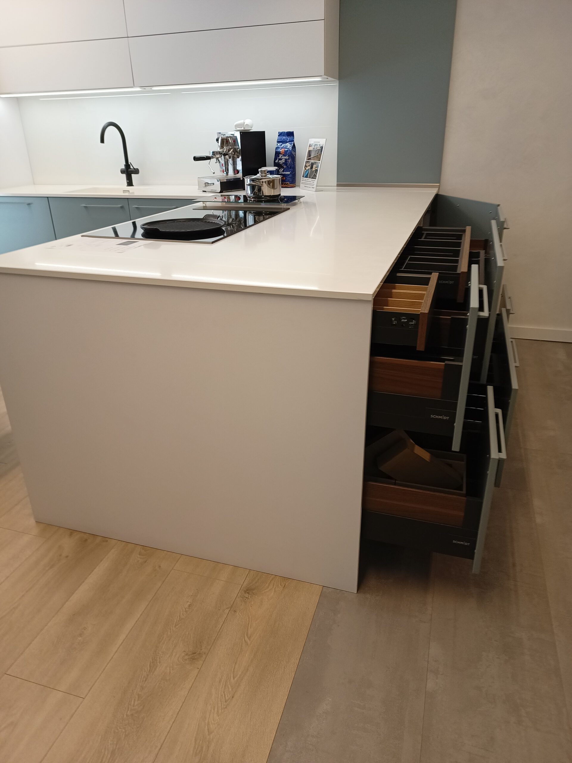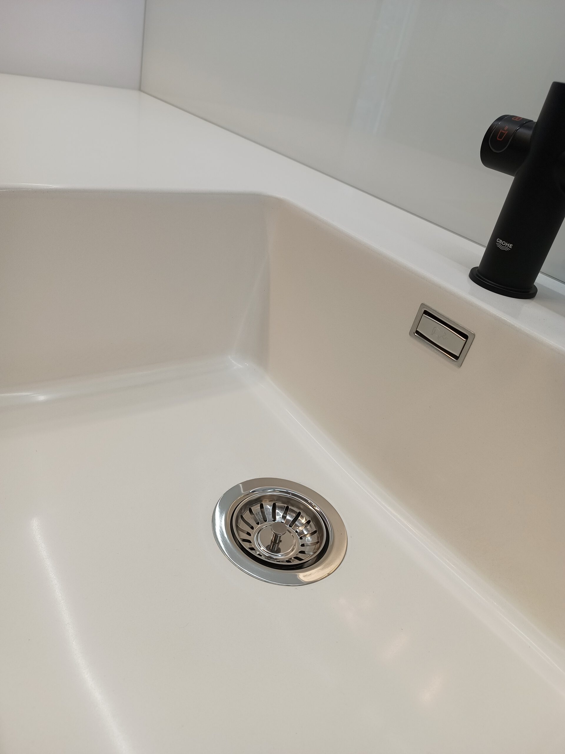 Het werkblad is uitgevoerd in stijlvol wit composiet, inclusief een naadloos ingelijmde spoelunit. De Grohe kokendwaterkraan voegt extra luxe en gebruiksgemak toe. De witte glazen achterwand maakt het geheel strak en tijdloos af.