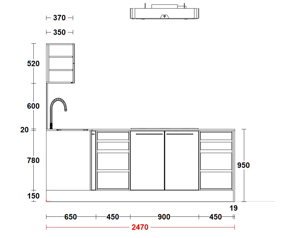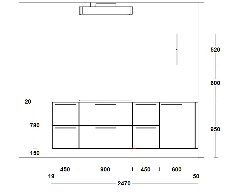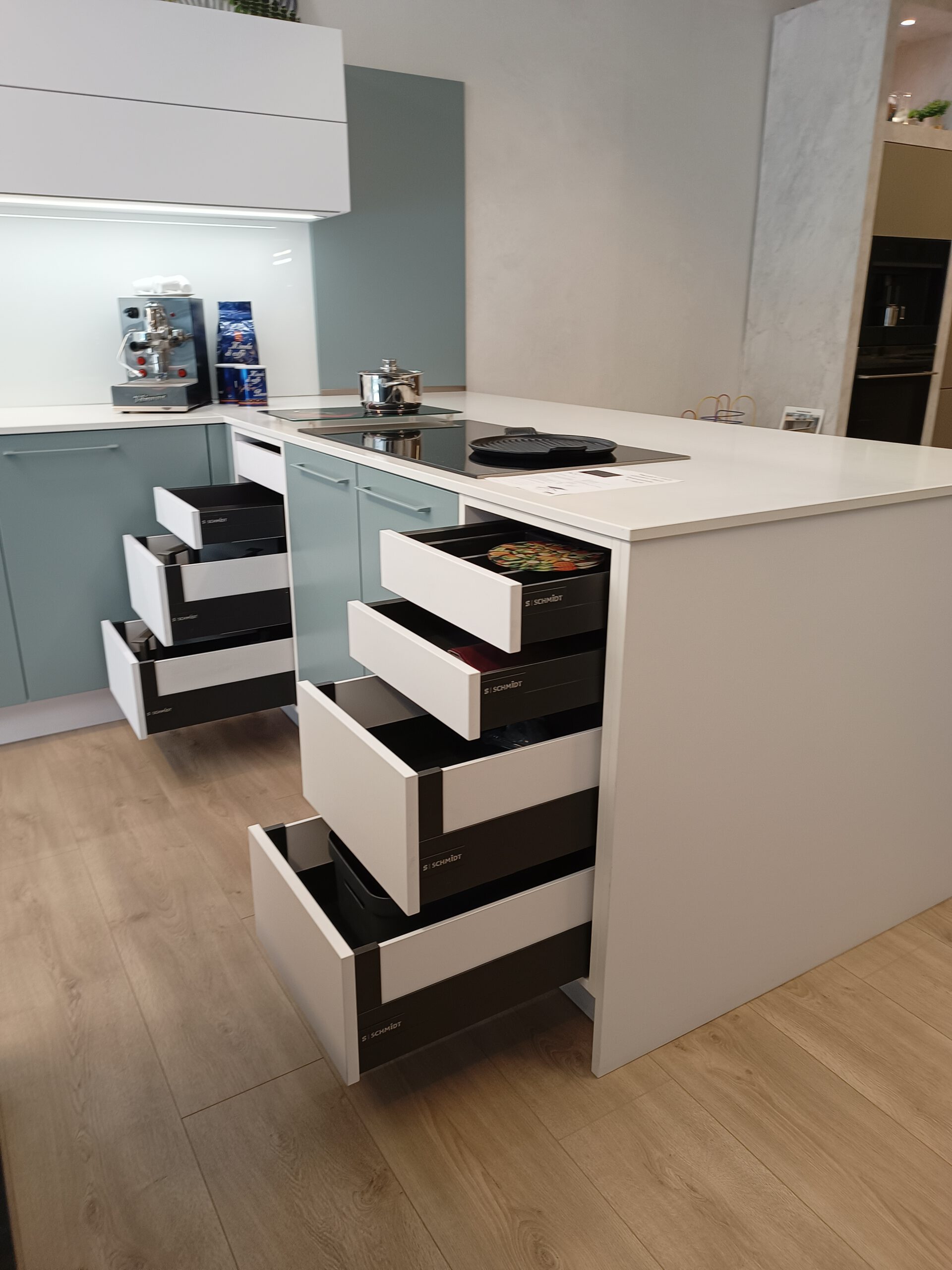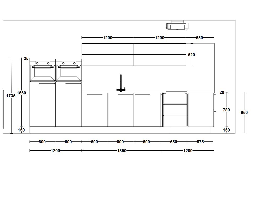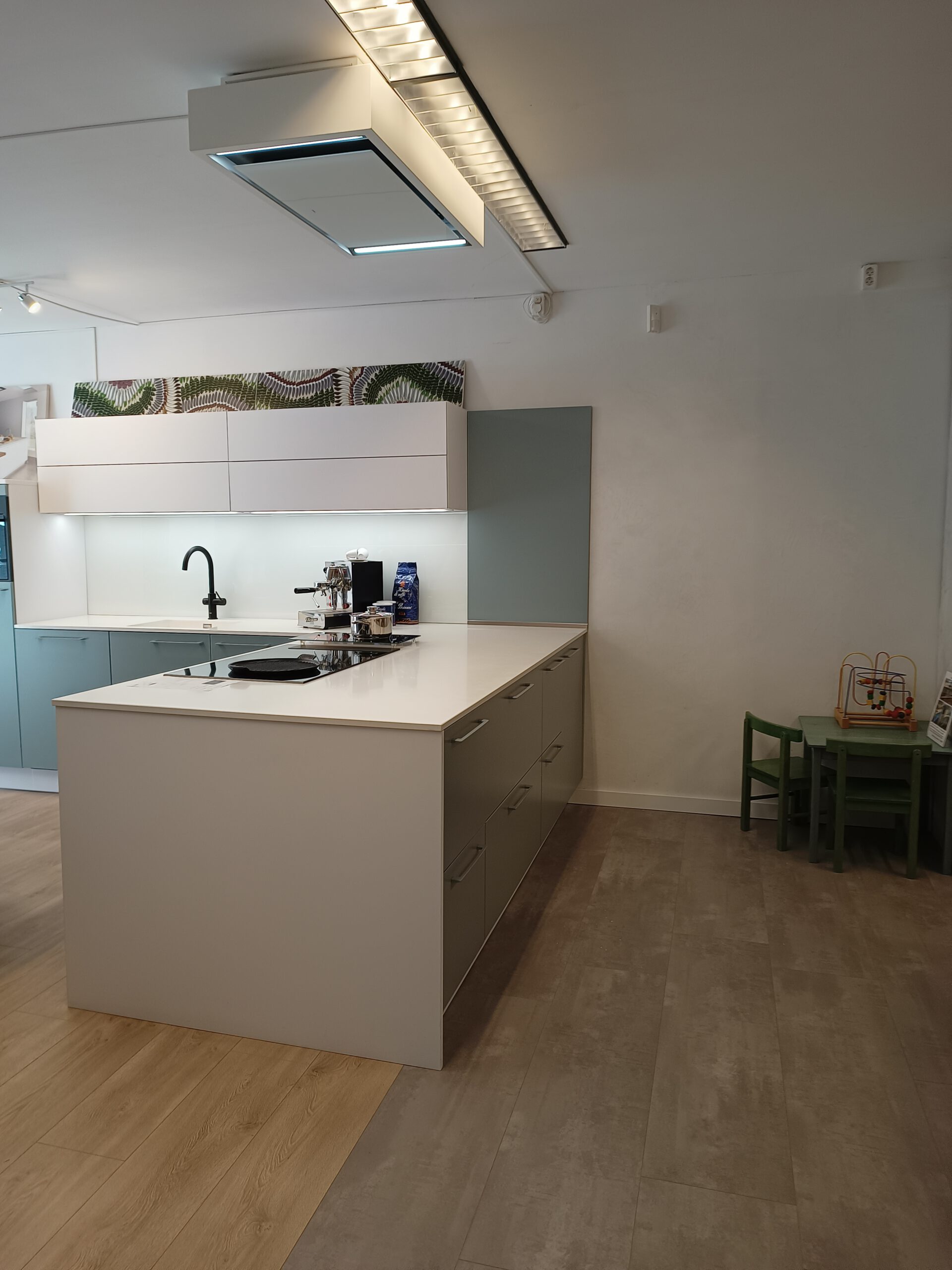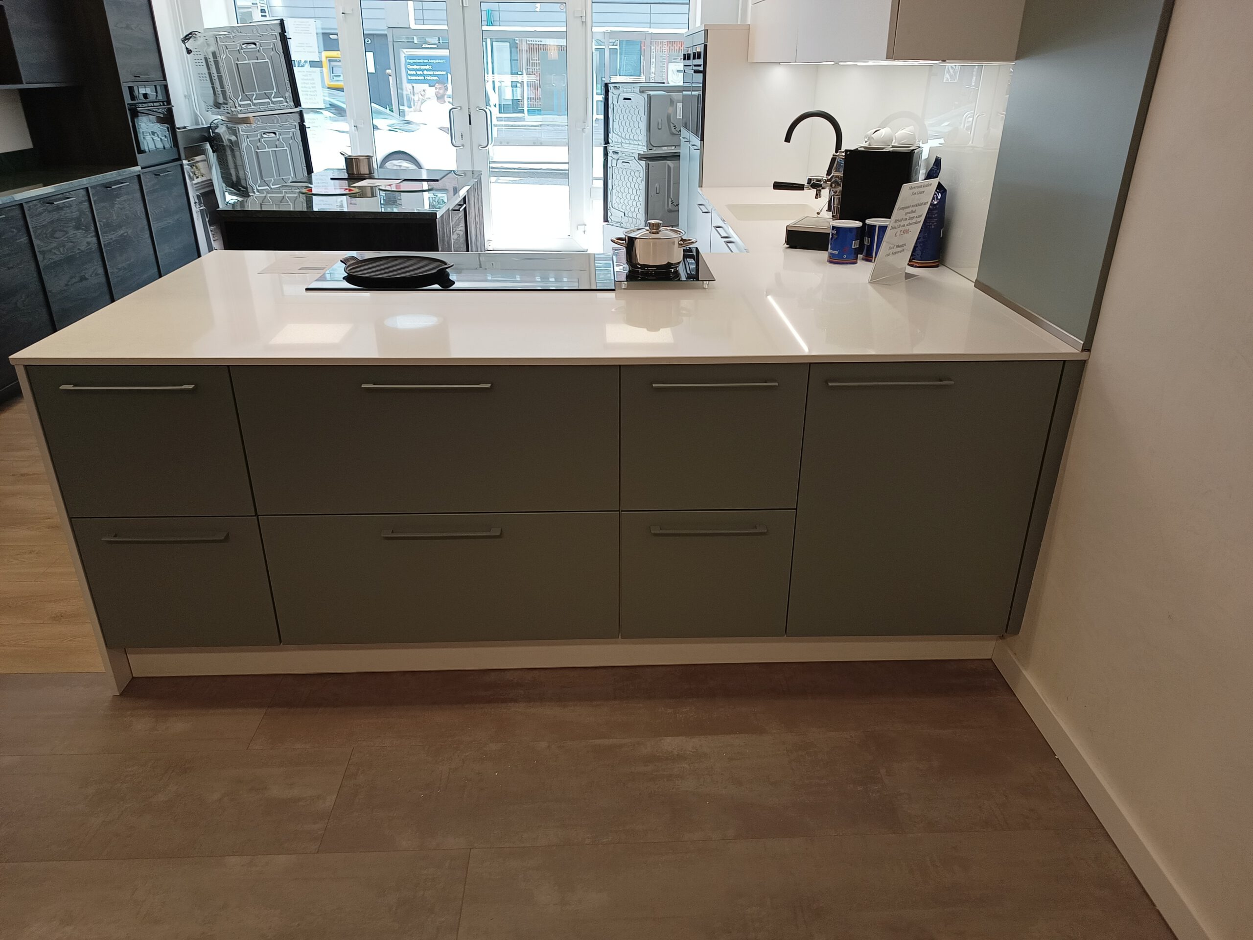 Deze zeer complete keuken combineert stijl en functionaliteit in één geheel. De lange zijde van maar liefst 425 cm biedt volop werk- en opbergruimte, terwijl het royale schiereiland van 247 x 120 cm de keuken een open en uitnodigende uitstraling geeft.