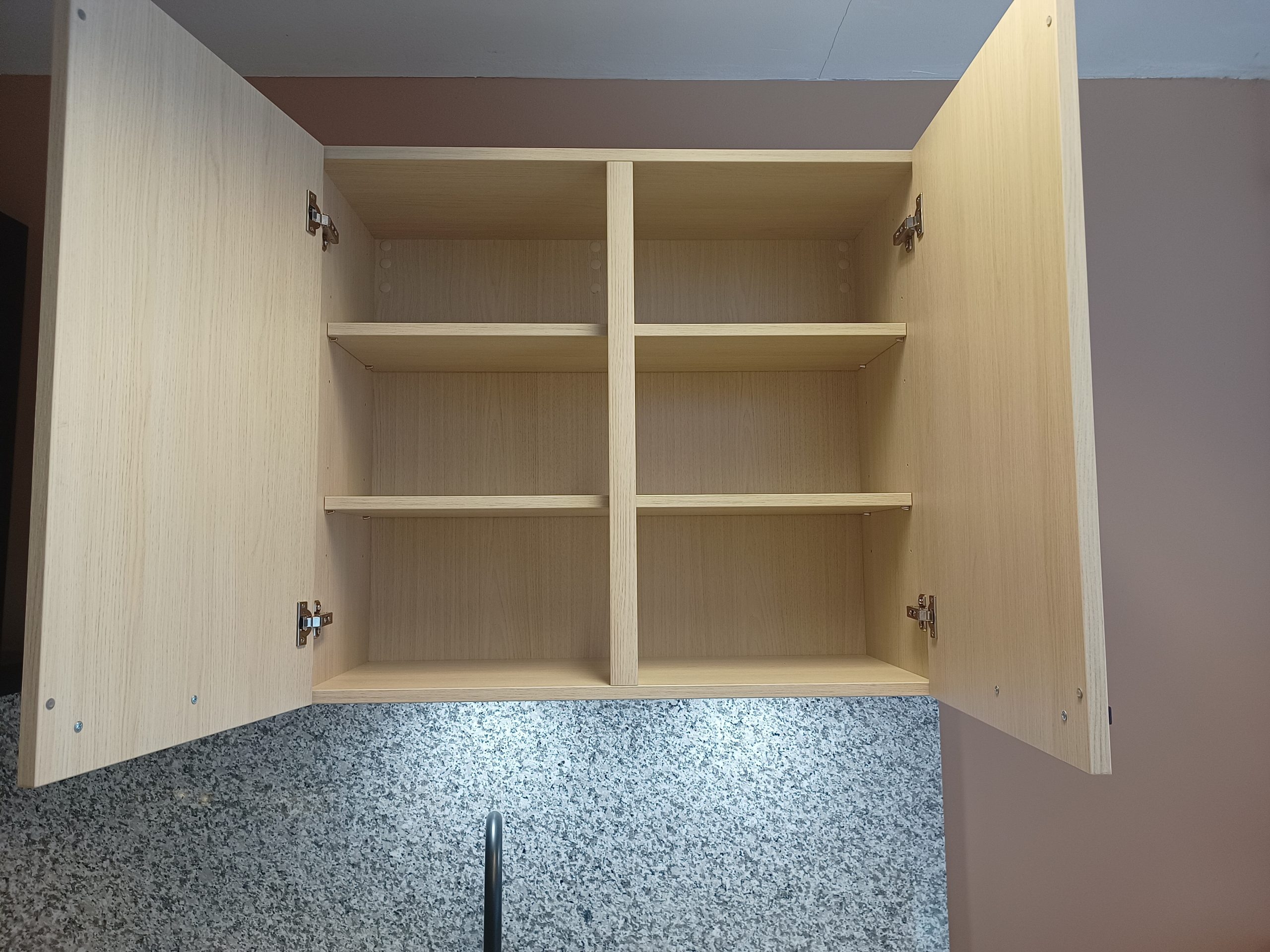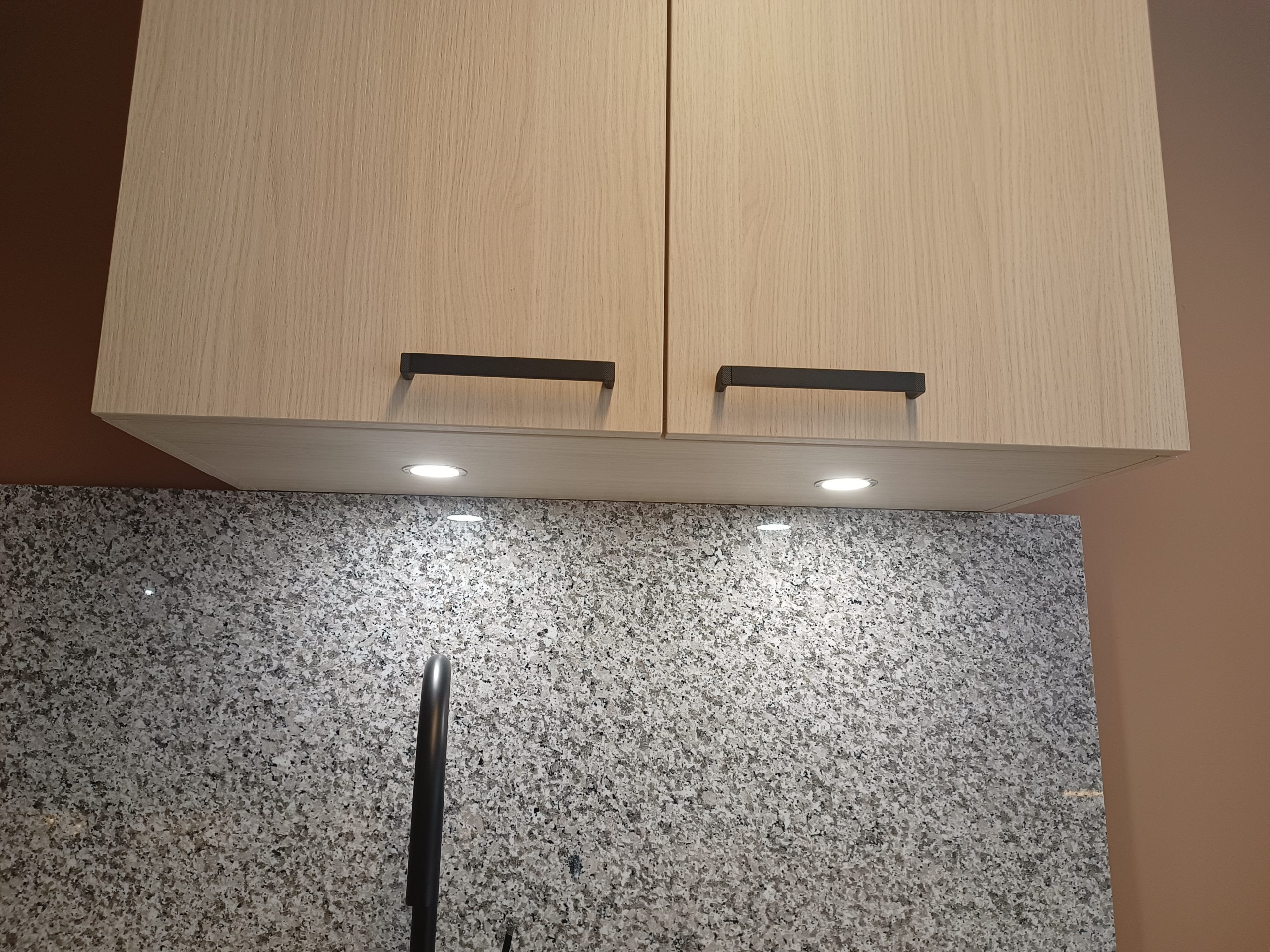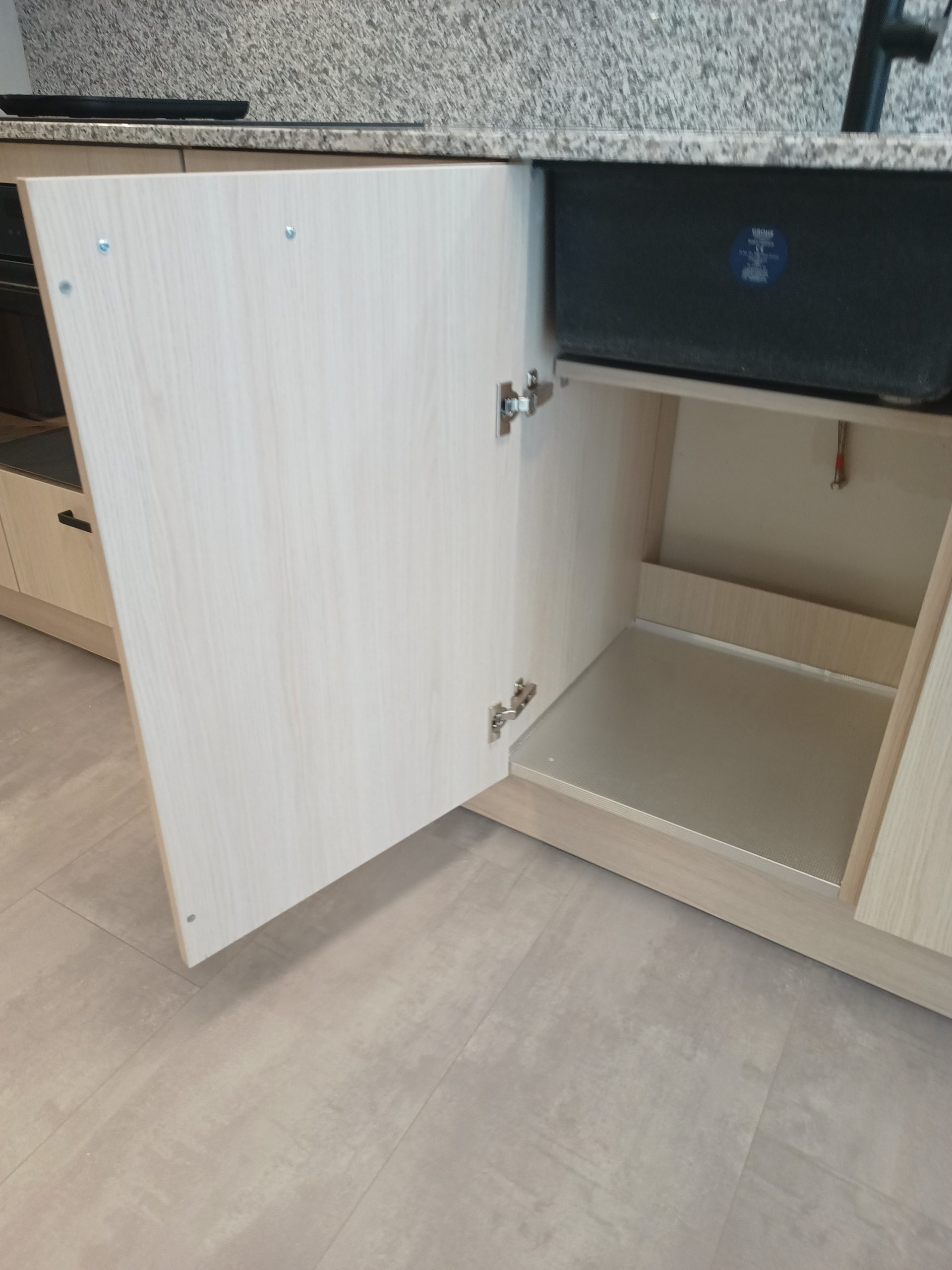 Het geheel wordt afgewerkt met een luxe granieten aanrechtblad en achterwand, een zwarte composiet onderbouw spoelbak en een bijpassende zwarte mengkraan.