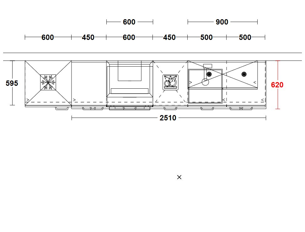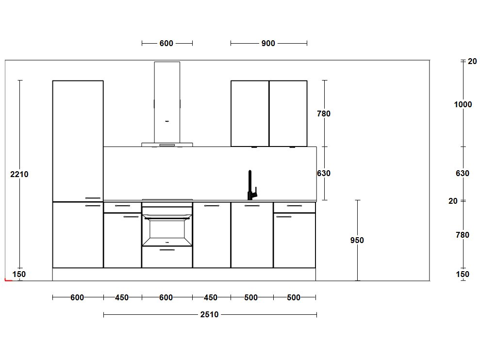 De keuken beschikt over een hoge kast met koel-vriescombinatie, meerdere onderkasten met lades en deuren, en een speciaal ingerichte kast met nis voor de oven. Er is een front voor een 45 cm brede vaatwasser, een kast voor de spoelbak en extra opbergruimte in een bovenkast van 90 cm breed met twee deuren en legplanken. De ingebouwde LED-spots in de bodem zorgen voor een stijlvolle en functionele verlichting.